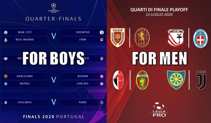 Giornata di sorteggi ad ogni livello per il calcio italiano. Oltre a quello di Champions ed Europa League nella mattinata di oggi è andato in scena anche il sorteggio dei playoff promozione di Serie C. Due palcoscenici completamente diversi che la Lega Pro, scherzando, mette a confronto con un simpatico post su Twitter:
