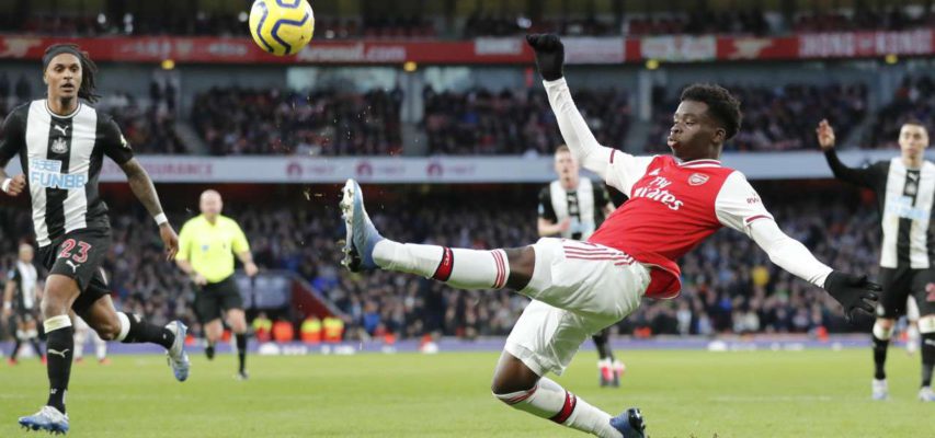 Arsenal's Bukayo Saka kicks the ball during the English Premier League soccer match between Arsenal and Newcastle at the Emirates Stadium in London, Sunday, Feb. 16, 2020.(AP Photo/Frank Augstein)