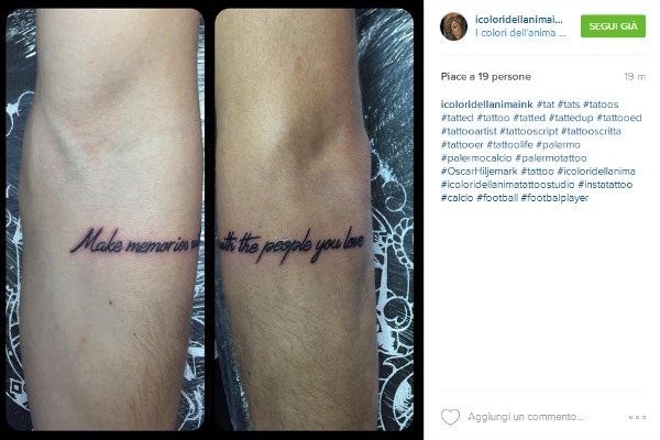 Anche Oscar Hiljemark è stato contagiato dalla moda dei tatuaggi. Ecco il nuovo tatoo del centrocampista svedese, che ha deciso di farsi incidere una frase sul braccio. Ecco la foto che mostra la nuova “opera” e il numero 10 rosanero in compagnia del tatuatore, come pubblicato da quest’ultimo su Instagram.