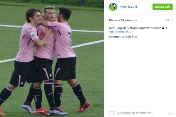 Nino La Gumina, attaccante della Primavera del Palermo, ha festeggiato con un post su Instagram il successo conquistato questo pomeriggio dai rosanero contro Frosinone al “Comunale” di Santa Flavia grazie ad una sua rete. In alto la foto.