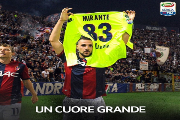 Attraverso il proprio account ufficiale “Instagram”, la serie A decide di celebrare il gesto di Mattia Destro, attaccante del Bologna, che al momento del gol ha mostrato la maglia del portiere e compagno di squadra Mirante, il quale ha avuto alcuni problemi cardiaci nelle ultime settimane. Ecco quanto scrive la massima serie: “Il grande cuore di Mattia Destro per un altro cuore, quello del portiere Antonio Mirante. L’attaccante del Bologna, dopo aver segnato la rete del 2-0, ha preso la maglia di Mirante, fermo da tempo per un problema al cuore, e ha festeggiato la rete alzandola al cielo in direzione proprio del portiere che ieri si trovava a bordo campo. Poi l’abbraccio tra i due e gli applausi del Dall’Ara per un gesto di due campioni dentro e fuori dal campo”. In alto, la foto in questione.