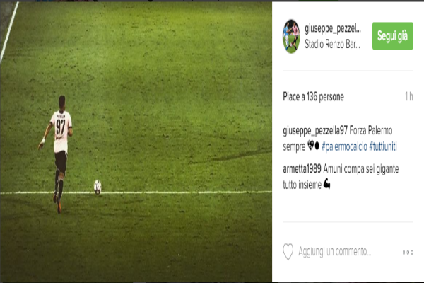 Giuseppe Pezzella, terzino sinistro del Palermo, ha pubblicato il seguente messaggio sul proprio profilo Instagram: “Forza Palermo sempre, tutti uniti!”. In alto la foto che lo ritrae in azione durante la sfida di ieri sera contro l’Olympique Marsiglia.