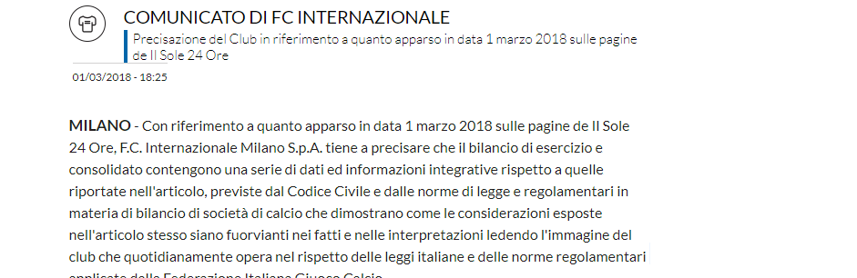 “Con riferimento a quanto apparso in data 1 marzo 2018 sulle pagine de Il Sole 24 Ore, F.C. Internazionale Milano S.p.A. tiene a precisare che il bilancio di esercizio e consolidato contengono una serie di dati ed informazioni integrative rispetto a quelle riportate nell’articolo, previste dal Codice Civile e dalle norme di legge e regolamentari in materia di bilancio di società di calcio che dimostrano come le considerazioni esposte nell’articolo stesso siano fuorvianti nei fatti e nelle interpretazioni ledendo l’immagine del club che quotidianamente opera nel rispetto delle leggi italiane e delle norme regolamentari applicate dalla Federazione Italiana Giuoco Calcio.