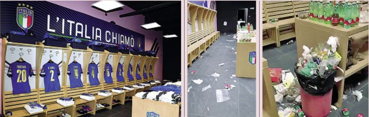 Il contenuto del video Sporcizia e confusione superiori a quelle che di solito si vedono negli stanzoni utilizzati da squadre di club dopo una qualsiasi partita di campionato, soprattutto a casa propria. E altrettanto sicuramente sproporzionate rispetto alla rabbia, alla delusione e allo sconforto del gruppo azzurro dopo la botta della mancata qualificazione al Mondiale. Il video è stato girato nel corridoio, nella sala massaggi, nei bagni e nelle docce e si indugia su ogni angolo dello spogliatoio, dunque si vede un po’ di tutto: anche materiale “tecnico” utilizzato dai giocatori (fasce elastiche, bende, asciugamani), ma soprattutto cartacce e cartoni vuoti, bottigliette d’acqua aperte, buste di plastica. E ancora un cesto di spazzatura stracolmo, immondizia rovesciata a terra, posate e avanzi di cibo, bucce di arance e di banane, tranci di crostata e cannoli siciliani. Addirittura, in bagno, mozziconi di sigarette.