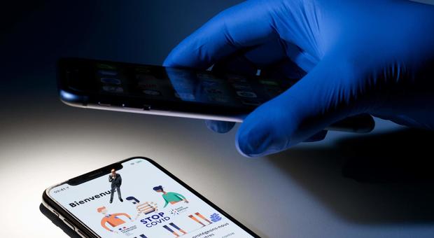 This picture taken on May 28, 2020, shows a figurin on a mobile phone diplaying a screenshot of the tracking application StopCovid developed by French government in an attempt to contain the spread of COVID-19 in Paris. (Photo by JOEL SAGET / AFP)