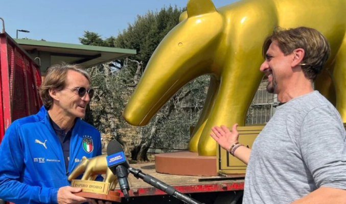 Con sportività, simpatia ed autoironia, Roberto Mancini, ct della Nazionale italiana reduce dalla disfatta con la Macedonia del Nord e la conseguente esclusione dalla prossima edizione della Coppa del Mondo di Qatar 2022, riceve l’ottavo Tapiro d’Oro della propria carriera dallo storico inviato di Striscia la Notizia Valerio Staffelli.