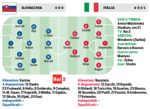 Come evidenzia ancora «Corriere dello Sport», la Slovacchia proverà a riscattarsi dopo la sconfitta in extremis con la Spagna. Attenzione ai cambi: fuori Holly, centrocampista adattato da numero 9, dentro uno tra Jambor e Cerepkai. Confermati invece i talenti Rigo, Sauer e Suslov, tra i più pericolosi della selezione di casa.