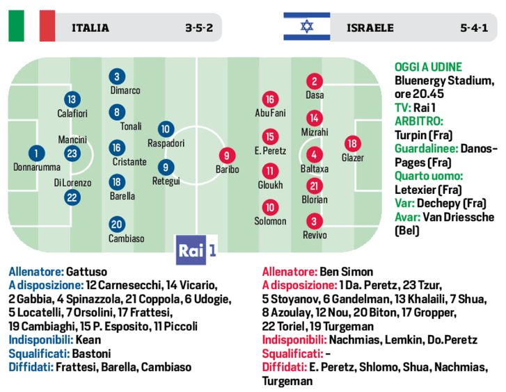 Come evidenzia ancora Fabrizio Patania sul Corriere dello Sport, Gattuso sembra orientato verso un 3-5-2, simbolo del suo pragmatismo. In regìa ballottaggio tra Cristante e Locatelli, con il primo favorito dopo la buona prova di Tallinn. In difesa entra Gianluca Mancini al posto dello squalificato Bastoni, completando il reparto con Calafiori e Di Lorenzo.