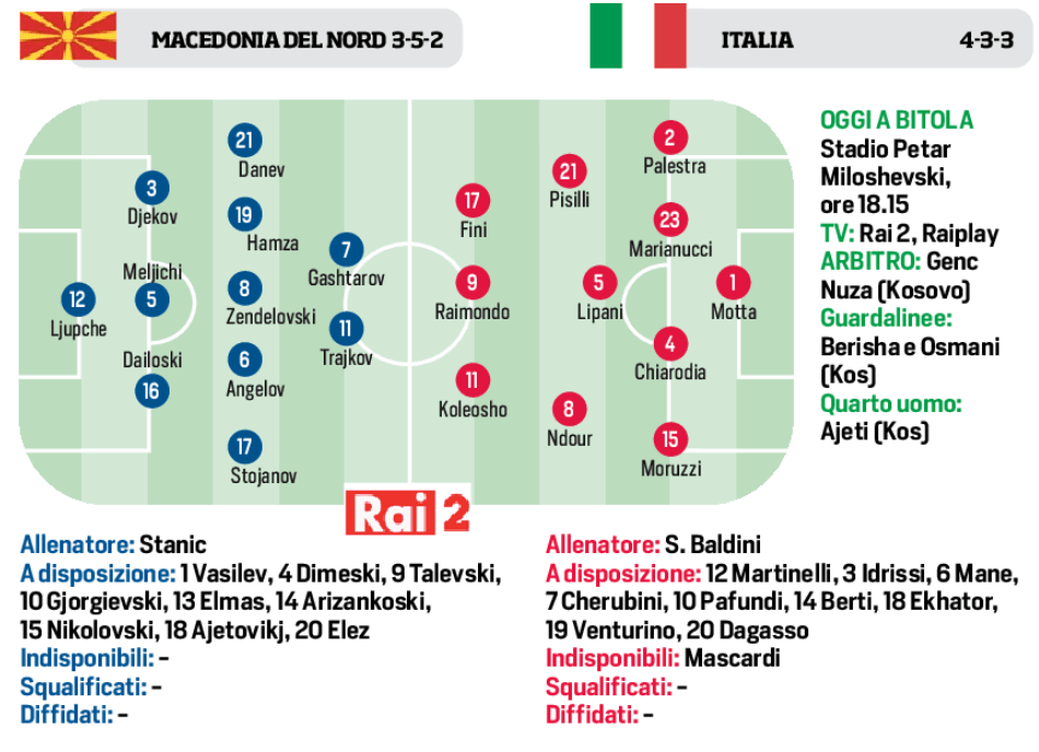 Il Corriere dello Sport, attraverso l’analisi di Patrick Iannarelli, mette in risalto anche l’aspetto motivazionale. Baldini ha citato la nazionale femminile di volley, campione del mondo a distanza di 23 anni, e il ruolo del tecnico Velasco: «È uno che sa toccare le corde dell’anima». Sul fronte opposto, il ct macedone Stanic ha promesso battaglia: «Abbiamo elaborato un piano di gioco, l’Italia ha ali veloci e grande organizzazione». Una sfida già da dentro o fuori per entrambe.