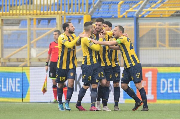 CASTELLAMMARE DI STABIA, ITALY - JANUARY 18: Juve Stabia players celebrate the 1-0 goal scored by Francesco Forte during the Serie B match between Juve Stabia and Empoli on January 18, 2020 in Castellammare di Stabia, Italy. (Photo by Francesco Pecoraro/Getty Images)