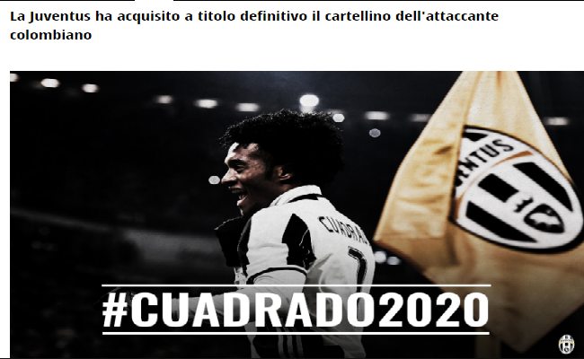 Attraverso una nota sul proprio sito ufficiale, la Juventus ha comunicato di aver riscattato a titolo definitivo il cartellino di Juan Guillermo Cuadrado. Ecco il comunicato: “Juventus Football Club S.p.A. comunica che, a seguito del verificarsi delle prestabilite condizioni contrattuali, è scattato l’obbligo di acquisto a titolo definitivo dal Chelsea Football Club Limited del diritto alle prestazioni sportive del calciatore Juan Guillermo Cuadrado Bello. Il corrispettivo previsto dagli accordi è di € 20 milioni pagabile in tre rate annuali a partire dal prossimo esercizio 2017/2018. Juventus aveva sottoscritto con lo stesso calciatore un contratto di prestazione sportiva fino al 30 giugno 2020”.
