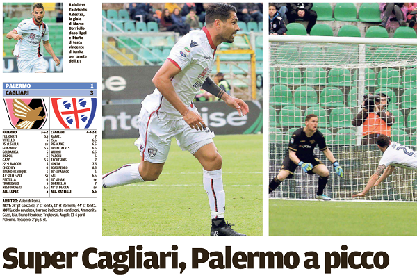 “Chi aveva malignamente pensato che il Cagliari potesse fare regali al Palermo ha preso una cantonata. I rossoblù non hanno fatto sconti all’ex Diego Lopez (lui e i suoi a fine gara sono stati sommersi dai fischi dei tifosi), vincendo in rimonta al “Barbera”, terzo successo in trasferta. La rete di Gonzalez ha illuso i siciliani che come altre volte sono crollati alla lunga. Una doppietta di Ionita (primi gol stagionali per il moldavo) e Borriello hanno affossato i rosanero, ormai con più di un piede in serie B. Tre punti che hanno un valore speciale, ottenuti grazie a una ripresa giocata con determinazione, personalità e tanta voglia di cancellare una prima frazione nella quale gli uomini di Rastelli ha subito per lunghi tratti gli avversari. Senza tre super parate di Rafael, le cose si sarebbero complicate. Era una tappa importante della stagione, perdere contro una squadra che ha l’acqua alla gola, che in casa aveva subito undici sconfitte (dodici con quella di ieri), avrebbe potuto alimentare tensioni. Un piccolo balzo in avanti nella classifica (tredicesimo posto), un segnale positivo per un rush finale che potrebbe regalare tante soddisfazioni a un Cagliari costretto a stare sempre sul pezzo. […]”. Questo quanto riporta “La Nuova Sardegna”.
