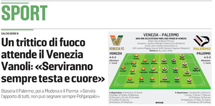L’edizione odierna de “La Nuova Venezia” si sofferma sulla squadra di Vanoli che oggi riceverà al “Penzo” il Palermo.