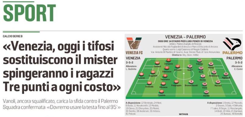 L’edizione odierna de “La Nuova Venezia” si sofferma sulla gara tra Palermo e Venezia in programma oggi e riporta le parole di Vanoli.