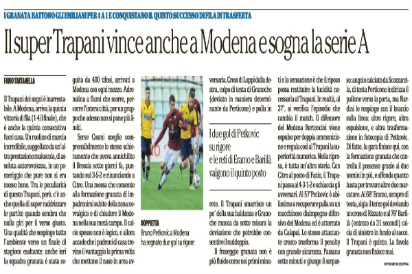 “Il Trapani dei sogni è inarrestabile. A Modena, arriva la quinta vittoria di fila (1-4 il finale), che è anche la quinta consecutiva fuori casa. Un ruolino di marcia incredibile, suggellato da un’altra prestazione maiuscola, di assoluta autorevolezza, in un pomeriggio che pure non si era messo bene. Tra le peculiarità di questo Trapani, però, c’è anche quella di saper raddrizzare le partite quando sembra che nulla giri per il verso giusto. Una qualità che sospinge tutto l’ambiente verso un finale di stagione esaltante: anche ieri la squadra granata è stata seguita da 400 tifosi, arrivati a Modena con ogni mezzo. Adrenalina a fiumi che scorre, percorre l’intera città, per un gruppo che adesso non si pone più limiti. Serse Cosmi sceglie comprensibilmente lo stesso schieramento che aveva annichilito il Brescia sette giorni fa, puntando sul 3-5-2 e rinunciando a Citro. Una mossa che consente alla formazione granata di impadronirsi subito della zona nevralgica e di chiudere il Modena nella sua metà campo. Il calcio spesso non è logico, e allora accade che i padroni di casa trovino il vantaggio la prima volta che mettono il naso in area avversaria. Cross di Luppi dalla destra, colpo di testa di Granoche (deviato in maniera determinante da Perticone) e palla in rete. Il Trapani smarrisce un po’ della sua baldanza e Granoche manca da sotto misura la deviazione che potrebbe consentire il raddoppio. Il fraseggio granata non è più fluido come nei primi minuti e la sensazione è che il riposo possa restituire la lucidità necessaria al Trapani. In realtà, al 37’, si verifica l’episodio che cambia il match. Il difensore del Modena Bertoncini viene espulso per doppia ammonizione e regala così al Trapani la superiorità numerica. Nella ripresa, è tutta un’altra storia. Con Citro al posto di Fazio, il Trapani passa al 4-3-1-2 e schiaccia gli avversari. Al 57’Petkovic è abilissimo a recuperare palla su un macchinoso disimpegno difensivo del Modena ed è atterrato da Calapai. Lo stesso attaccante croato trasforma il penalty con grande sicurezza. Passano sette minuti e giunge il sorpasso: angolo calciato da Scozzarella, di testa Perticone indirizza il pallone verso la porta, ma Nardini lo respinge con il braccio sulla linea: altro rigore, altra espulsione, e altra trasformazione in fotocopia di Petkovic. Di fatto, la gara finisce qui, con la formazione granata che controlla il possesso grazie ai due uomini in più, e affonda quanto basta per trovare altre due marcature. Al 68’ Eramo, sempre di testa, sigla il terzo gol deviando un cross di Rizzato e al 79’ Barillà (entrato da 31 secondi) calcia di sinistro in fondo al sacco. Il Trapani è quinto. La favola granata non finisce mai”. Questo quanto scrive l’edizione odierna de “La Repubblica”.