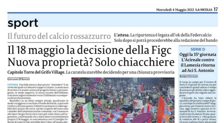 L’edizione odierna de “La Sicilia” si sofferma sul Catania e sulla data del 18 maggio in cui è attesa la decisione Figc sul titolo in D.