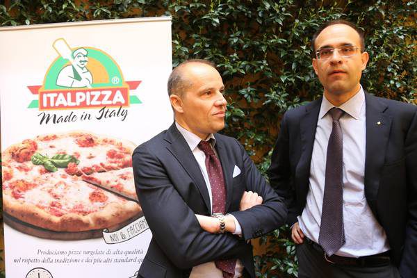 Roberto Moncalvo, Presidente di Coldiretti (d) e Massimo Sereni, direttore commerciale di Italpizza alla presentazione della pizza tutta di ingredienti certificati italiani all'Hotel Majestic ,Bologna 14 aprile 2015.ANSA/GIORGIO BENVENUTI