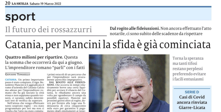 L’edizione odierna de “La Sicilia” si sofferma sull’arrivo di Mancini al Catania.