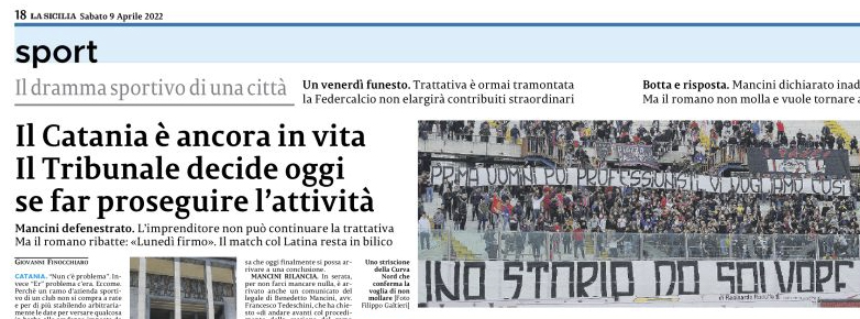 L’edizione odierna de “La Sicilia” si sofferma sulla situazione relativa al Catania appeso ad un filo.