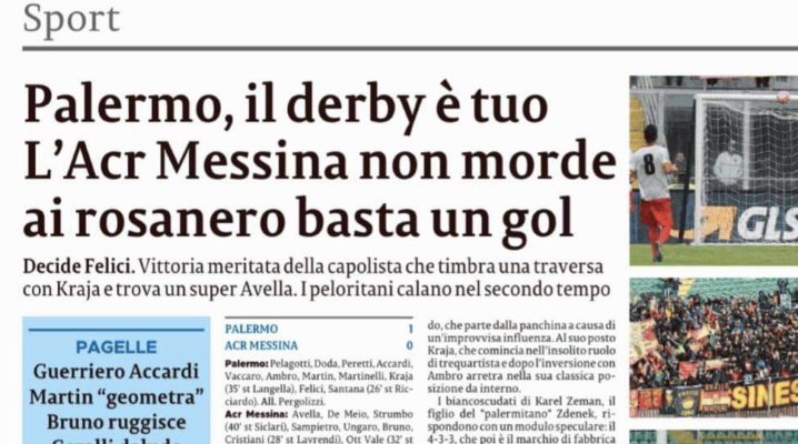 Dopo una punto nelle ultime due partite, il Palermo di Pergolizzi ha finalmente rialzato la testa ed è tornato alla vittoria. Il ritorno al successo dei rosanero è arrivato in una giornata speciale, quella del derby contro l’Acr Messina, che il Palermo ha vinto grazie ad una prodezza di Felici al minuto 64. “Palermo, il derby è tuo. L’Acr Messina non morde, ai rosanero basta un gol” è il titolo scelto dal quotidiano “La Sicilia” in merito alla partita andata in scena ieri pomeriggio allo stadio “Renzo Barbera”, che prosegue “Vittoria meritata della capolista che timbra una traversa con Kraja e trova un super Avella”.