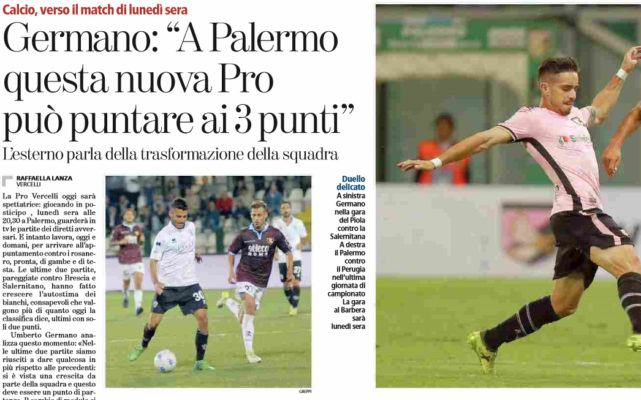 Al Barbera i padroni di casa partono favoriti: «Andiamo a Palermo con la voglia di fare bene – dice Germano -. Nelle ultime due prestazioni meritavamo qualcosa di più: soprattutto nell’ultima sfida con la Salernitana. In questo periodo stiamo bene, ma non abbiamo ancora i 90’ nelle gambe. Stiamo lavorando in questa direzione. Dopo le prime tre partite giocate non bene, ci siamo presi anche noi giocatori le nostre responsabilità». La Pro comunque a Palermo non ha nulla da perdere: «Dobbiamo andare là tranquilli, perché non abbiamo nulla da perdere. Mi aspetto una grande battaglia: loro sono una squadra forte, che vuole vincere il campionato. Non è a punteggio pieno, ma sono tosti. A noi però servono punti. Vedere la Pro Vercelli là in fondo alla classifica, mi dà fastidio. E’ vero che il campionato è ancora lungo, ma al più presto dobbiamo raggiungere un successo per lasciare ad altri questa maglia nera». Il nuovo modulo è dispendioso, a livello energetico, ma molto più vivace e consono alla Pro Vercelli: «In campo dobbiamo correre tanto, questo ci chiede il mister. Noi centrocampisti non sempre riusciamo a coprire tutto il campo: su quel fronte dobbiamo migliorare. Dobbiamo raggiungere l’autonomia dei 90’, altrimenti rischiamo grosso». Alla Pro mancano i gol: è questa la priorità, adesso: «E’ capitata anche a me l’occasione di andare a rete, ma l’ho sprecata – dice il centrocampista vercellese -. Dobbiamo invertire la rotta sotto porta. Dopo tre gare che non avevano portato a nulla, ci siamo detti che doveva cambiare qualcosa. Abbiamo ottimizzato la fase difensiva, ora arriveranno anche i gol»”. Questo ciò che si legge sull’edizione odierna de “La Stampa”.