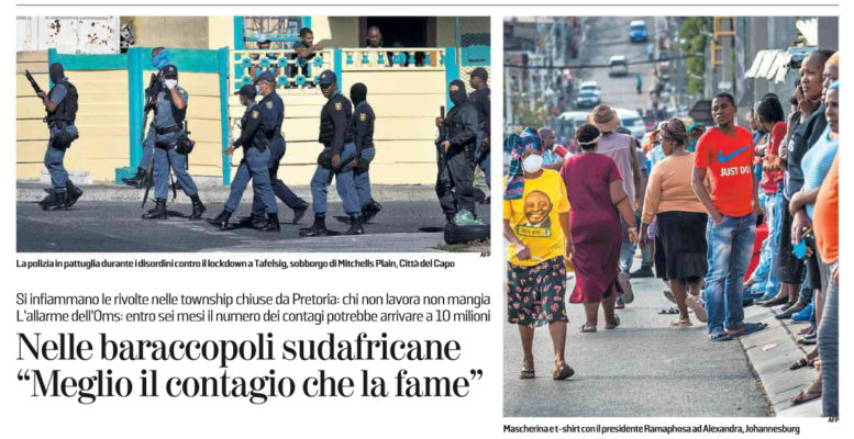 La Stampa: “Nelle baraccopoli sudafricane «Meglio il contagio che la fame». L’allarme dell’Oms: entro sei mesi il numero dei contagi potrebbe arrivare a 10 milioni”
