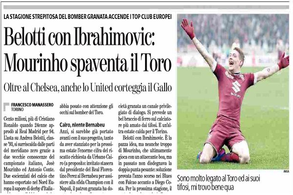 “Cento milioni, più di Cristiano Ronaldo quando 24enne approdò al Real Madrid per 94. L’asta su Andrea Belotti, classe ’93, si surriscalda dalle parti del meridiano zero grazie a due vecchie conoscenze del campionato italiano, Josè Mourinho ed Antonio Conte. Due «scienziati del calcio che hanno esportato nel Nord Europa il sapore di derby d’Italia sebbene non l’abbiano mai vissuto da diretti antagonisti – e le loro grandi ambizioni: dopo aver vinto tanto con Inter e Juventus hanno trovato nuovi e (ancor più) grandi palcoscenici per stabilire chi è il migliore. L’ultima notizia che rimbalza dai giornali inglesi è che lo Special One, dall’estate scorsa allenatore del Manchester United,abbia posato con attenzione gli occhi sul bomber del Toro. Cairo, niente Bernabeu Anzi, si sarebbe già portato avanti con il suo progetto, tanto da aver stanziato per la prossima estate l’enorme cifra del riscatto richiesta da Urbano Cairo (a proposito: invitato stasera dal presidente del Real Florentino Perez al Bernabeu per assistere alla sfida Champion con il Napoli, il patron granata ha dovuto rinunciare alla serata per motivi di lavoro): sul gioiello del patron alessandrino però è forte da tempo l’ex tecnico bianconero, che si è mosso per primo a caccia del dopo Diego Costa, a luglio destinato ad accettare la cascata di Yuan cinesi (in lizza c’è anche l’ex pupillo Alvaro Morata del Real). E di fatto Conte ha già aperto con la società granata un canale privilegiato di dialogo. Si prevede un bel braccio di ferro sul calciatore più amato dai tifosi. E un’altra estate calda per il Torino. Belotti con Ibrahimovic. È la pazza idea, ma neanche troppo di Mourinho, che ultimamente gioca con un attaccante boa, ma in passato non disdegnava la doppia punta pesante: soluzione provata l’anno scorso nei Blues con Falcao accanto a Diego Costa. Per la prossima stagione, il portoghese rimescolerà di nuovo le forze nel tentativo di rilanciare le ambizioni dei Red Devils e farà spendere alla proprietà statunitense un’altra montagna di sterline, dopo quelle servite per accaparrarsi Paul Pogba. Accanto a Ibra, di gran lunga il migliore dei suoi con 15 reti in 24 partite, l’ex Inter ha disegnato due soluzioni, una più leggera. Sono molto legato al Toro ed ai suoi tifosi, mi trovo bene qua Andrea Belotti. Centravanti del Toro con Antoine Griezmann, attaccante dell’Atletico Madrid e l’altra più pesante con l’ariete del Toro. La seconda strada è quella che sta prendendo più corpo, anche alla luce delle relazioni dei suoi osservatori di fiducia, da un po’ di tempo ormai habitué degli stadi su cui si cimenta il 9 di Mihajlovic, e sempre più convinti delle possibilità del granata”. Questo quanto riportato da “La Stampa”.
