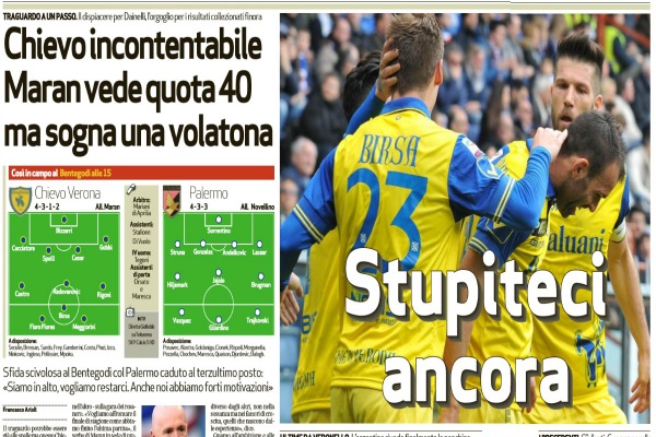 “Il traguardo potrebbe essere già alle spalle ma questo Chievo ormai pensa più in grande. Pensa oltre. Oltre i 40 punti che oggi ha la possibilità di scavallare, oltre l’appuntamento di giornata, oltre se stesso e i propri limiti. Il bello del campionato, a otto giornate dalla fine, sta nel lusso di poter provare ad alzare continuamente l’asticella anche perché staccare la spina con un altro mese e mezzo di gare davanti sarebbe sconveniente. E non piacerebbe affatto a Rolando Maran, uno per il quale la sfida ai propri limiti è pane quotidiano. Peccato che il medesimo lusso non se lo possa permettere il Palermo di Walter Alfredo Novellino, che giusto oggi transita al Bentegodi per raccogliere punti diventati vitali per riacchiappare la permanenza in categoria, obiettivo divenuto più labile soprattutto dopo il fresco aggancio in classifica del Carpi. IL CONFRONTO. Oggi come oggi il Chievo è una realtà fatta e finita e apprezzata; i rosanero un gruppo che – viceversa – ha perduto identità e soprattutto quota in classifica. La questione-salvezza si è fatta angosciante e così anche per i gialloblù della Diga l’impegno si è trasformato in un confronto scivoloso, dagli sviluppi imprevedibili, da giocare con i piedi ma soprattutto con la testa. Prestando attenzione ai risvolti nervosi. Perché il fattore psicologico può incidere in maniera determinante – in un senso o nell’altro – sulla gara dei rosanero. «Vogliamo affrontare il finale di stagione come abbiamo finito l’ultima partita», il verbo di Maran in sede di presentazione. «Con lo stesso spirito, con la stessa voglia di stupire. Nella sosta abbiamo lavorato per ripartire nel modo migliore e senza abbassare la tensione. I ragazzi rispondono nel modo giusto come mi aspettavo: ci sono i presupposti per fare bene. Abbiamo una classifica inimmaginabile, non preventivata: vogliamo mantenerla» […]“. Questo quanto scrive l’edizione odierna de “L’Arena di Verona”.