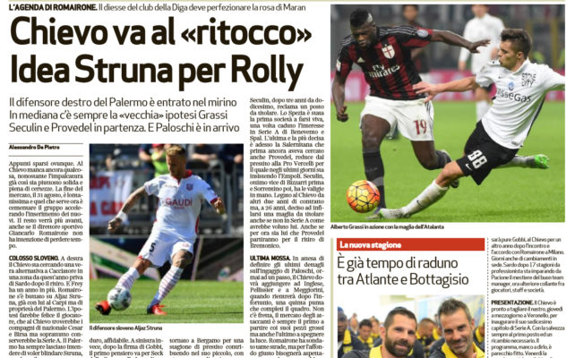 “Appunti sparsi ovunque. Al Chievo manca ancora qualcosa, nonostante l’impalcatura già così sia piuttosto solida e piena di certezze. La fine del mercato, il 31 agosto, è lontanissima e quel che serve ora è cementare il gruppo accelerando l’inserimento dei nuovi. Il resto verrà più avanti, ancheseil direttore sportivo Giancarlo Romairone non ha intenzione di perdere tempo. COLOSSO SLOVENO. A destra il Chievo sta cercando una vera alternativa a Cacciatore in una zona da quest’anno priva di Sardo dopo il ritiro. E Frey ha un anno in più. Romairone s’è buttato su Aljaz Struna, già con lui al Carpi ma di proprietà del Palermo. L’ipotesi farebbe felice il giocatore, che al Chievo troverebbe i compagni di nazionale Cesar e Birsa ma soprattutto conserverebbe la Serie A. Il Palermo ha sempre lasciato intendere di voler blindare Struna, ma dopo il mancato passaggio della società da Zamparini a Baccaglini le regole potrebbero cambiare in fretta. Di fatto Struna è sul mercato, anche se il Palermo per il suo cartellino vuole essenzialmente soldi, al massimo allungando l’operazione alla fine della prossima stagione con la formula del prestito con obbligo di riscatto in caso di salvezza del Chievo. L’obiettivo è concreto, oltre a Cacciatore è necessario dotarsi subito di un elemento di prospettiva. E Struna, che compirà 27 anni il 4 agosto, risponde a tutti i requisiti, anche di versatilità, richiesti da Maran. Forte fisicamente, duro, affidabile. A sinistra invece, dopo la firma di Gobbi, il primo pensiero va per Seck della Roma sulla base di un prestito biennale.”. Questo quanto si legge sull’edizione odierna de “L’Arena”.