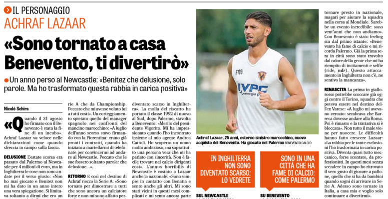 RITORNO: E così nel destino di Achraf riecco la Serie A: «Sono tornato per dimostrare a tutti che sono ancora un calciatore forte e non mi sono affatto perso. Lo scriva pure: Lazaar non è diventato scarso in Inghilterra». La molla del riscatto ha portato il classe 1992 di nuovo al Sud, dopo Palermo, stavolta a Benevento:«Merito del presidente Vigorito. Mi ha impressionato quando l’ho incontrato insieme al mio agente Andrea Cattoli. Ho scoperto un uomo molto ambizioso, ma soprattutto una persona vera che mi ha parlato con sincerità. Non è facile trovare nel calcio dirigenti così». L’annus horribilis di Newcastle è costato a Lazaar anche la nazionale: «Sono sempre in contatto con Benatia e sento anche gli altri. Mi sono stati vicini in questi mesi complicati e mi sento ancora parte integrante del gruppo. Punto a tornare presto in nazionale, magari per aiutare la squadra nella corsa al Mondiale. Sarebbe un evento incredibile: sono vent’anni che non andiamo». Con Benevento è stato feeling sin dal primo istante: «Benevento ha fame di calcio e mi ricorda Palermo. Già la primasera in città sono stato travolto dal calore della gente che mi ha riempito di incitamenti e selfie (ride, ndr). Questo attaccamento in Inghilterra nonc’è, ne sentivo la mancanza».