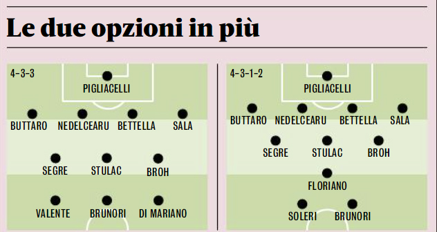 Corini rifletterà fino all’ultimo sulle proprie scelte, anche perché sarà anche difficile tenere fuori dal primo minuto chi ha fatto molto bene nelle prime due gare di campionato e ha pure fatto gol come Valente a Bari ed Elia con il Perugia. E poi c’è il tema dell’intercambiabilità degli elementi di cui tenere conto, per la capacità di assicurare equilibrio in fase di non possesso. Perché Di Mariano e Valente sono in grado di giocare sia destra che a sinistra ed Elia e l’ex Carrarese garantiscono un grande contributo in fase di contenimento, così come lo stesso Floriano che nel caso del 4-3-1-2 fornirebbe un appoggio utile anche a un tandem di attaccanti composto da Brunori e Soleri.