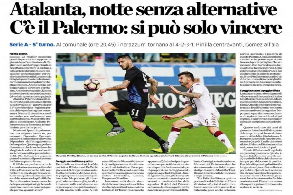 “La miglior occasione possibile per vincere. Appena tre giorni dopo l’umiliazione di Cagliari ecco subito l’opportunità di riscattarsi e mettere la sordina a ogni genere di rumors. Atalanta-Palermo è già una partita chiave per la stagione nerazzurra. I punti in pali sono tre, ma potrebbero valere trenta. Il Palermo, formazione tra le meno competitive di A, è l’avversario che tutti vorrebbero incontrare in questa particolare situazione. Naturalmente ci saranno anche delle pressioni psicologiche con le quali fare i conti: “Se non vinci questa partita, quando vinci?”. Questo ciò che si legge sull’edizione odierna de “L’Eco di Bergamo”.