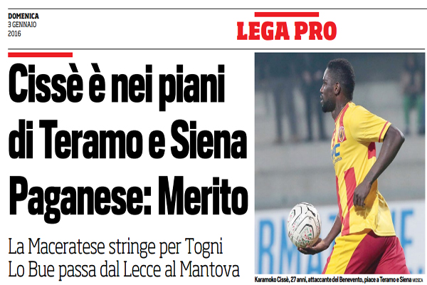 L’edizione odierna de “Il Corriere dello Sport” fa il punto sul mercato delle squadre di Lega Pro: “Domani si apre ufficialmente il mercato invernale di Lega Pro e si intensificano le trattative e gli accordi tra le società. Questa sessione di calciomercato si concluderà il primo febbraio alle ore 23. tre giorni cruciali con tutti gli addetti ai lavori sono prevista all’Ata Hotel di Milano il 28 e il 29 gennaio e naturalmente il primo febbraio giorno di chiusura. SIENA. Il Siena lavora ad uno scambio con il Catania: il difensore Luigi Silvestri (22) e il centrocampista Salvatore Burrai (28) in Sicilia, il difensore loris Bacchetti (22) e il centrocampista Giuseppe Russo (28) in bianconero. Dopo le quattro uscite di Bonazzoli, Bindi, Piredda e Guglielmi l’obiettivo della società toscana è l’attaccante Saveriano Infantino (28) della Carrarese. Arriva, poi Alessandro Bacci, portiere (20) dal Pisa, per la difesa pronti i terzini Juan Cruz Alvaro Armada, argentino della Pistoiese, e Samuele Sereni terzino mancino del Mantova. Piace anche il centrocampista Giampaolo Calzi (30) del Venezia. Il Savona segue il fantasista Luca Tremolada (25) dell’Arezzo e il difensore Gaetano Capogrosso (26 anni) del Mestre in serie D. Nel Prato in uscita dopo l’attaccante Lorenzo Benedetti (23) anche il giovane difensore Lorenzo Matteo (19) è passato al Viareggio in serie D. In settimana andrà in porto il passaggio del difensore Andrea Sbraga (23) dalla Carrarese al Padova. Un accordo di massima è stato raggiunto tra i club. MACERATESE. Domani potrebbe essere un giorno importanti per l’evolversi della trattativa tra la Maceratese e il brasiliano Romulo Eugenio Togni (33). L’accordo c’è già, Togni però temporeggia perché sta trattando la sua buonuscita con l’Avellino. Il tecnico Bucchi conosce bene il centrocampista per averlo allenato nel Pescara in serie A. ecco il teramo. Per rinforzare il suo attacco il Teramo sta pensando a Karamoko Cissé (27) del Benevento, che per le sue doti da contropiedista sarebbe utile soprattutto in trasferta dove la squadra abruzzese stenta parecchio. Ci sarebbe però da vincere la concorrenza del Siena. Per la Reggiana qualora non dovesse materializzarsi l’affare Perez pronto Salvatore Caturano (25) attaccante napoletano che è del Bari in prestito all’Ascoli. Piace anche Christian Cesaretti (28), punta del Pontedera. L’Albinoleffe ha richiesto all’Andria l’esterno sinistro Cortellini. L’Andria però non sembra intenzionata a privarsi del giocatore. affare fatto. Da Lecce arriva Francesco Lo Bue (26). L’esterno difensivo destro ha trovato l’accordo con il Mantova e sarà ufficializzato lunedì all’apertura del mercato. Cresciuto nel Trapani, partecipando da protagonista alla galoppata dalla serie D alla serie B, Lo Bue si è trasferito nell’agosto scorso a Lecce. Titolare nelle prime tre gare di campionato, non ha poi più trovato spazio: a Mantova cerca il rilancio. QUI PAGANI. Con la Paganese si allena i l’attaccante esterno Jaime Leòn Merito (32) colombiano: ha giocato con anche con Arzanese, Latina e Noto. Da ieri con biancorossi del Rimini il centrocampista di origine kosovara Rijat Shala (classe 1983). MASCARA in SERIE D. Giuseppe Mascara (37), attaccante svincolatosi dal Siracusa, ha trovato l’accordo con lo Scordia (Serie D, girone I). RINNOVO. Tra tanti movimenti anche un rinnovo: l’attaccante Andrea Brighenti (classe 1987), capitano della Cremonese ha allungato il contratto sino al 2017. Il difensore Andrea De Rossi (21) del Catania potrebbe ritornare all’Akragas. Infine, il centrocampista Ante Kuseta (20) della Casertana quasi certamente lascerà il club campano: tra le squadre interessate ci sono anche il Martina e la Pro Piacenza”.