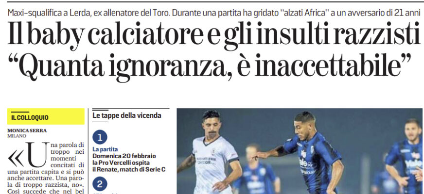 «Una parola di troppo nei momenti concitati di una partita capita e si può anche accettare. Una parola di troppo razzista, no». Così succede che nel bel mezzo di una partita di Lega Pro, neanche tanto tesa, nel corso di una rimessa laterale, un allenatore, Franco Lerda della Pro Vercelli, urli «Africa, alzati!» a un giovane attaccante della squadra avversaria, la brianzola Renate. «Nel 2022 è inaccettabile: questa è ignoranza pura e non merita di essere commentata», dice a due giorni dai fatti Mohammed Chakir, il calciatore preso di mira. Ventuno anni, cittadino italiano, Chakir è nato a Guastalla, in provincia di Reggio Emilia, da genitori di origine marocchina: «Mio padre è qui da oltre quarant’anni, è impiegato come capo reparto in un’azienda, dove lavorano anche i miei fratelli più grandi. In paese i Chakir sono considerati da tutti una famiglia italiana. Mai abbiamo subito atti di razzismo», racconta il giovane, che ha studiato in Italia e gioca a calcio da quando aveva sei anni. All’inizio si era molto arrabbiato, ma ora è soddisfatto dal provvedimento preso dal giudice sportivo: una squalifica per undici giornate, fino al 28 aprile, e quindi fino alla fine del campionato, a Lerda.