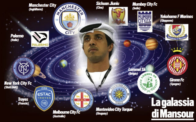 Adesso è una squadra di calcio al completo. Con l’acquisto del Palermo, il City Football Group degli emiri di Abu Dhabi è sbarcato nell’undicesima nazione del suo impero calcistico. L’Italia entra in una distinta che comprende Inghilterra (Manchester City), Francia (Troyes), Spagna (Girona), Belgio (Lommel), Stati Uniti (New York City), Austra[1]lia (Melbourne City), Giappone (Yokohama Marinos), India (Mumbay City), Cina (Sichuan Jiuniu), Uruguay (Montevideo City Torque). Europa, Asia, Australia, Sud e Nord America: sulla galassia calcistica creata negli Emirati Arabi non tramonta mai il sole.