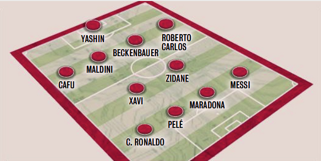 Il meglio Intanto è sbilanciata in attacco col meglio del passato e del presente. Maradona e Pelé, Messi e Cristiano Ronaldo. A centrocampo ha scelto Zinedine Zidane e lo spagnolo del Barcellona Xavi, 4 Champions League vinte, un Mondiale e due Europei. E poi dietro i brasiliani Cafu e Roberto Carlos, il nostro Paolo Maldini, unico italiano, e Franz Beckenbauer. Certo i posti erano undici, ma qualche campione manca.