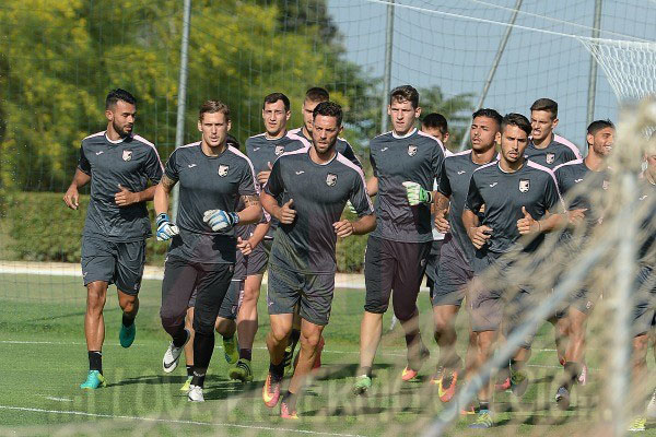 Dopo il riscaldamento e la esercitazioni con la palla, i rosanero di Davide Ballardini stanno svolgendo una partitella a tema con tre porte lavorando sull’uno contro uno e l’azione del rinvio.