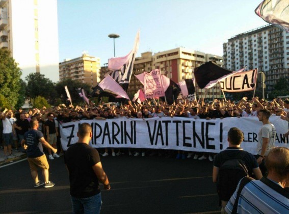 Prosegue la protesta dei tifosi del Palermo contro la gestione del presidente Zamparini. In alto una foto dei manifestanti.