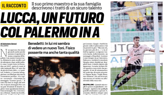 L’edizione odierna del “Corriere dello Sport” si sofferma sull’ultimo arrivato in casa Palermo, Lorenzo Lucca, che ha bagnato il proprio esordio col gol nella sfida contro il Biancavilla. Il papà afferma: «Lorenzo arrivò al campo con il cappellino bianconero e Benedetti ridendo lo riprese: “Sei giovane e per oggi va bene. Hai coraggio. Ma è la prima e l’ultima volta”. Inutile dire che poi il cappellino sparì. Se oggi si apre una prospettiva è, comunque, grazie al settore giovanile del Torino. Poi, bisogna trovare la propria dimensione, però Lorenzo è riconoscente alla società che lo ha plasmato». Il gol si è trasformato in una delle chiavi ad aprire il suo cassetto dei sogni: «Portare il Palermo in A».