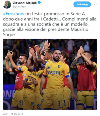 Il presidente del CONI, Giovanni Malagò, tramite il proprio profilo Twitter ha fatto i complimenti al Frosinone per la promozione in A, ma per lui sono arrivati solo insulti. Di seguito il post in questione: