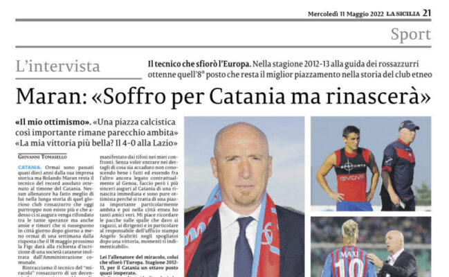 L’edizione odierna de “La Sicilia” ha riportato un’intervista a Rolando Maran il quale ha parlato in merito al Catania.