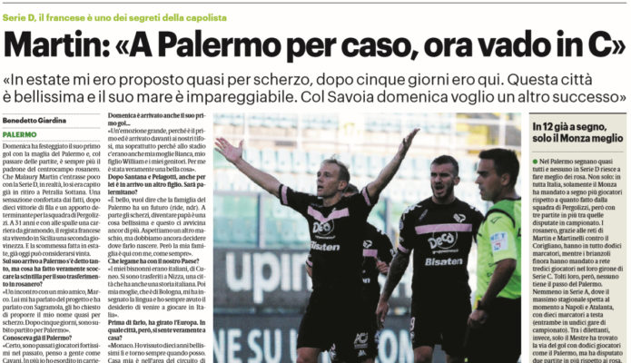L’edizione odierna del “Giornale di Sicilia” riporta un’intervista realizzata al metronomo del Palermo, Malaury Martin. Che legame ha con il nostro Paese? «I miei bisnonni erano italiani,di Cuneo. Si sono trasferiti a Nizza, una città che ha anche una storia italiana. Poi mia moglie, che è di Bologna, mi ha insegnato la lingua e ho sempre avuto il desiderio di venire a giocare in Italia». Prima di farlo, ha girato l’Europa. In quale città, però, si sente veramente a casa? «Monaco. Ho vissuto dieci anni bellissimi lì e torno sempre quando posso. Casa mia è nell’area del circuito di Montecarlo, di gare ne ho viste tante e ho anche amici che lavorano per quell’evento. La Formula 1 mi piace e la seguo, ma non è la mia passione principale. Quella è il mare, mi piace fare immersioni subacquee e Palermo è il massimo. Era da un decennio che non vivevo in una città con un mare così bello». Sta imparando a conoscere Palermo? «Non ho girato molto,anche perché non sono venuto qui per fare il turista. La prima volta in cui mi sono trovato al centro storico è stata perla presentazione della squadra al Comune, ma è veramente bello». Tornando al campo: la Serie C è un obiettivo o un passaggio intermedio? «Intanto l’obiettivo è battere il Savoia domenica prossima, poi sarà quello di vincere la partita successiva. Quest’anno abbiamo l’obbligo di vincere il campionato, ma dobbiamo restare tranquilli e non pensare troppo al futuro»