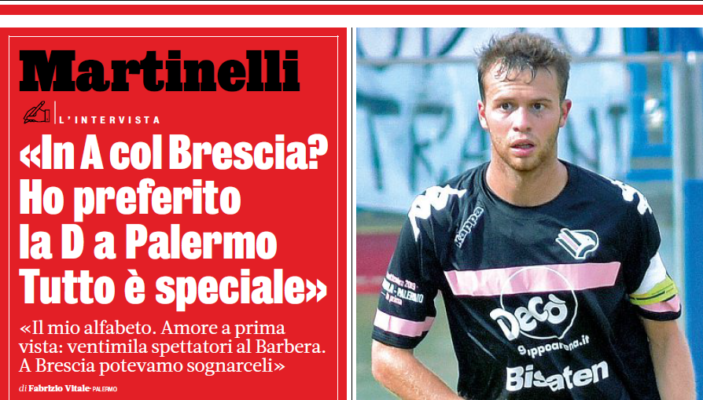 L’edizione odierna della “Gazzetta dello Sport” riporta un’intervista realizzata ad Alessandro Martinelli, centrocampista del Palermo. D come Serie D. Ha mai avuto un ripensamento per essere sceso nei dilettanti? «No, è stata una sfida personale, mi sono voluto mettere in gioco per tornare di nuovo in alto, spero che questa scelta coraggiosa venga premiata». E come estro nell’adattarsi a più ruoli. Da mezzala a trequartista Pergolizzi la impiega in varie in varie zone a metà campo. «Faccio un po’ tutti i ruoli, ma preferisco giocare da mezzala. L’allenatore mi utilizza con il piede invertito per inserirmi e fare qualche gol».