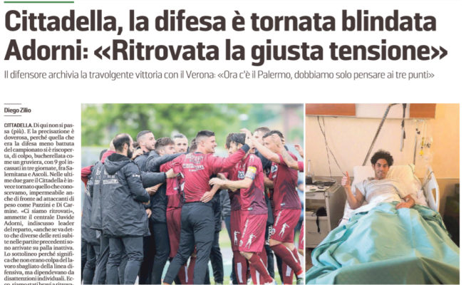 Il Mattino: “Cittadella, la difesa è tornata blindata. Adorni: «Ritrovata la giusta tensione. A Palermo per i 3 punti»”