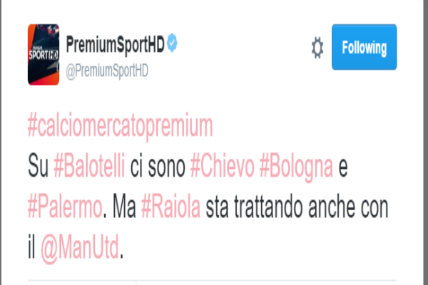 Con questo tweet di pochi minuti fa, la pagina Twitter di “Mediaset Premium” scrive del caso Balotelli, cercato da alcuni club italiani (Chievo, Bologna e Palermo) ma anche esteri. Questo quanto viene scritto nel post: “Su Balotelli ci sono Chievo, Bologna e Palermo. Ma Raiola sta trattando anche con il ManUtd”. In alto, la foto del tweet in questione.