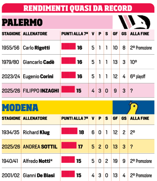 Anche il Palermo, spiega Pierluigi Capuano sulle colonne del Corriere dello Sport, è a un passo dal suo rendimento-record. Con 16 punti, i rosanero eguagliano i risultati dei campionati 1955-56 (allenatore Carlo Rigotti), 1979-80 (Giancarlo Cadè) e 2023-24, sotto la gestione Eugenio Corini, poi sostituito da Mignani. Oggi Inzaghi e Sottil sono protagonisti assoluti della Serie B, con il primo che conferma la sua consuetudine alle zone alte della classifica: dal Venezia 2017-18 al Benevento 2019-20, passando per l’esperienza al Brescia e il miracolo playoff con la Reggina nel 2022-23, fino alla recente promozione con il Pisa.