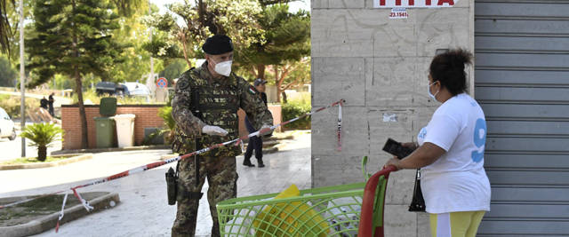 Un militare all'interno della zona rossa di Mondragone (Caserta) dove è esploso un focolaio che ha portato finora a 49 casi accertati di positività al Covid 19, 26 giugno 2020. ANSA/FUSCO