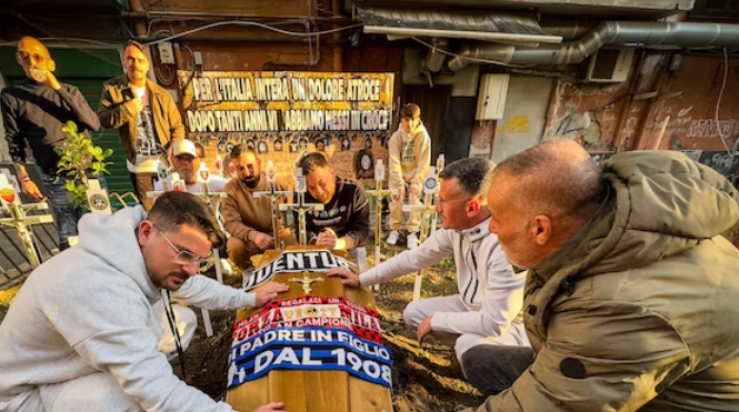 La città di Napoli si prepara a festeggiare lo scudetto. Alcuni sostenitori azzurri hanno usato una bara con alcune sciarpe a rappresentare le altre formazioni italiane alle spalle degli uomini di Spalletti.