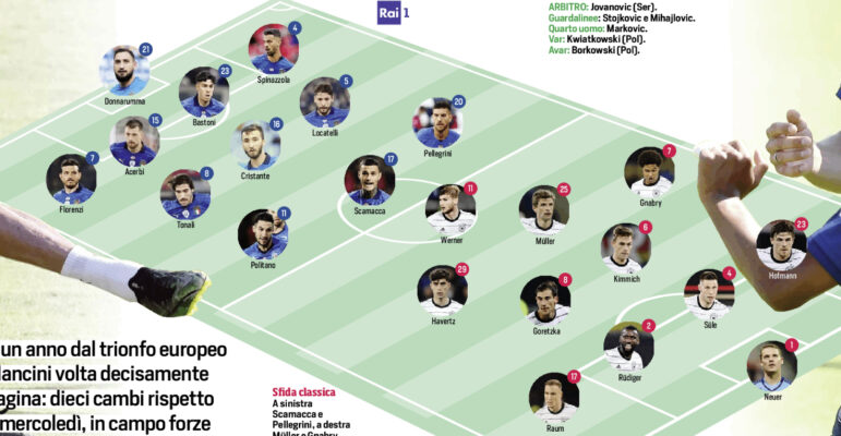 L’estate scorsa, ricordate? I cori erano tutti azzurri. Ora sembra arrivato solo il tempo delle stecche per l’Italia campione d’Europa. Dopo la sciampata con l’Argentina, in partita secca, ecco la più classica delle sfide nazionali, quella con i nemici amatissimi della Germania, a Bologna oggi e a Mönchengladbach il 14 pv, che promette una notte nibelungica per i nostri eroi londinesi. Inizia così, col botto, questa dieci giorni di Mancini & C. in tour, per le piazze della Nations League, mai così elevata a potenza, dato che ci aspettano anche Ungheria (a Cesena) e soprattutto l’Inghilterra (a Wolverhampton).
