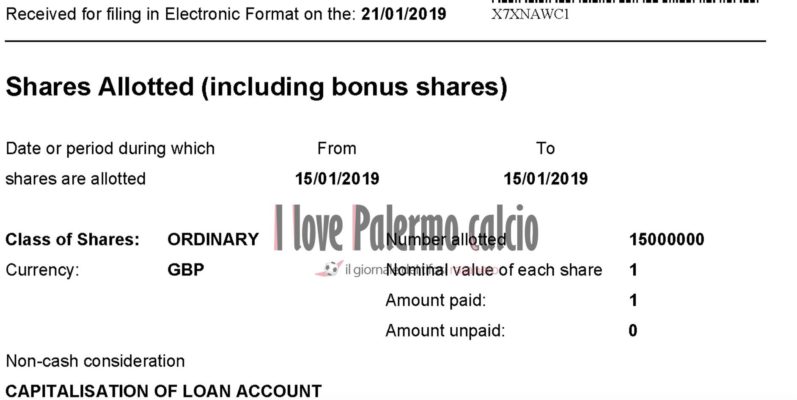 In data odierna, sul sito della Companies House è stato registrato l’aumento di capitale annunciato il 15 gennaio scorso dalla Sport Capital Group. Attraverso i documenti pubblicati sul registro delle imprese britannico, è scritto a chiare lettere che si tratta di “Non-cash consideration” e “Capitalisation of loan account”, dunque non denaro liquido ma una capitalizzazione di loan notes. I 15 milioni di sterline registrati oggi come aumento di capitale della Sport Capital Group Investements, infatti, sono gli ormai famosi titoli di prestito (loan notes) di cui parlava il comunicato pubblicato su NEX dalla Sport Capital Group. In alto la foto del documento.